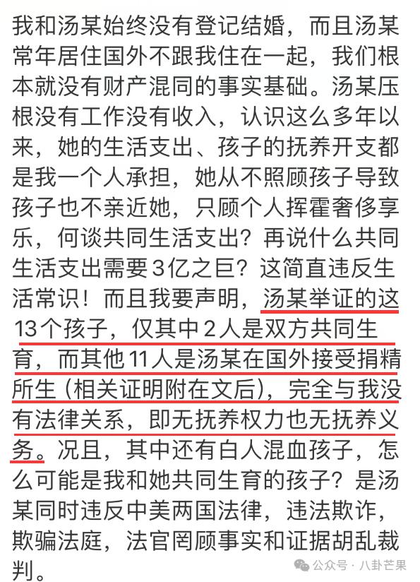 他想生很多娃,又怕娃长大了有权分家产,竟然想出了自己做 " 捐精者 " 这一损招。孩子在美国登记在跟自己没有婚姻关系的汤女士一人名下,在文件上完全撇清自己的养育法律责任,他只是一个善良的捐精者。而且这还可以控制汤女士,因为他一旦中断养娃的经济来源,女方养不起孩子就很麻烦。他哪天不想管这些孩子了,也可以完全不管。