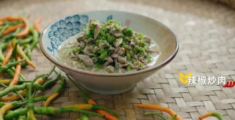 将一年生的原种猪肉切成小片,肉既不焯水也不过油,经过大火爆炒后,加入剁碎的土贡椒,最后加入清水将肉汁和辣椒素充分融合,整个过程只加入少许盐提味。