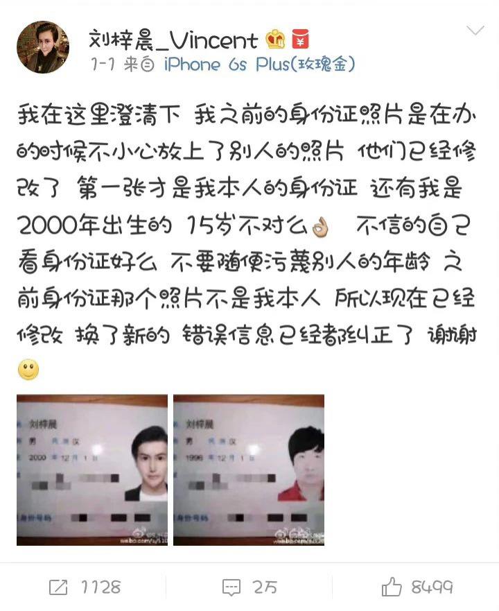 他赶忙发文解释说,那是别人的照片弄错了,又放了一张新的身份证照片,上面显示 2000 年出生,才刚刚 15 岁。