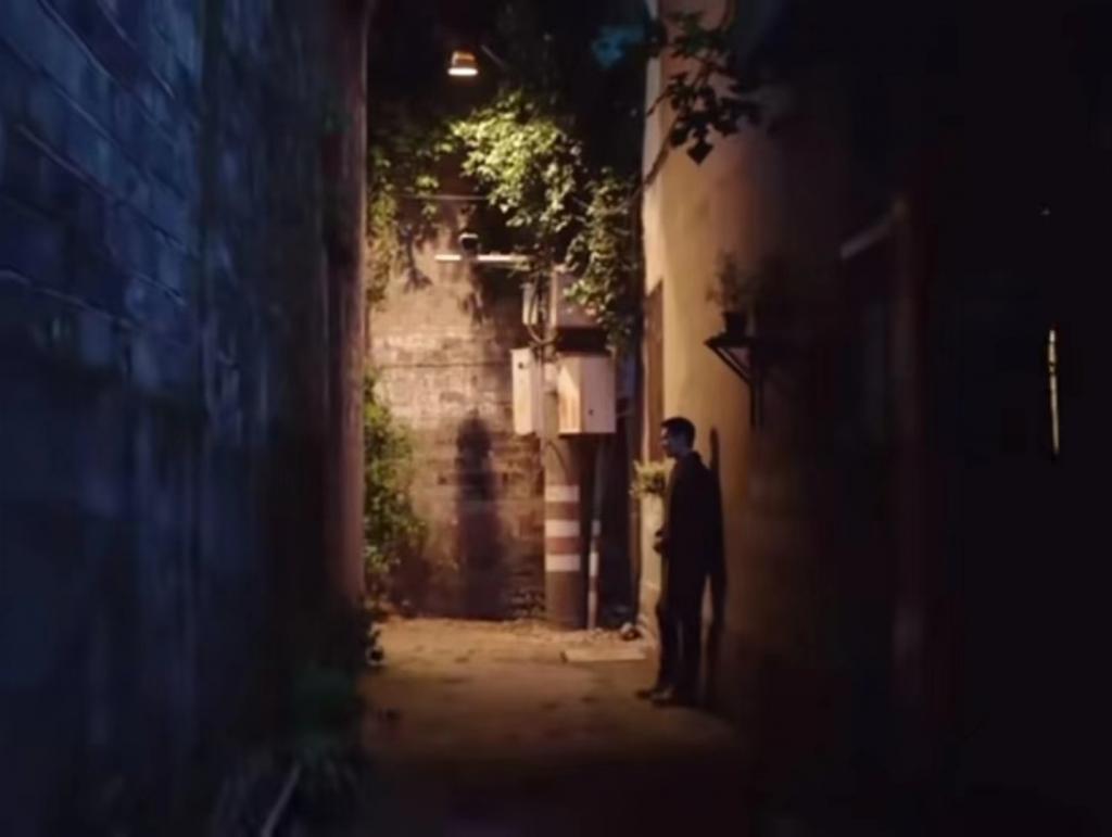 再来看看宋焰接许沁下班,女主自己打车回来,独自走在幽长又黑暗的小巷,男主就是找了个打光合适的位置干站着: