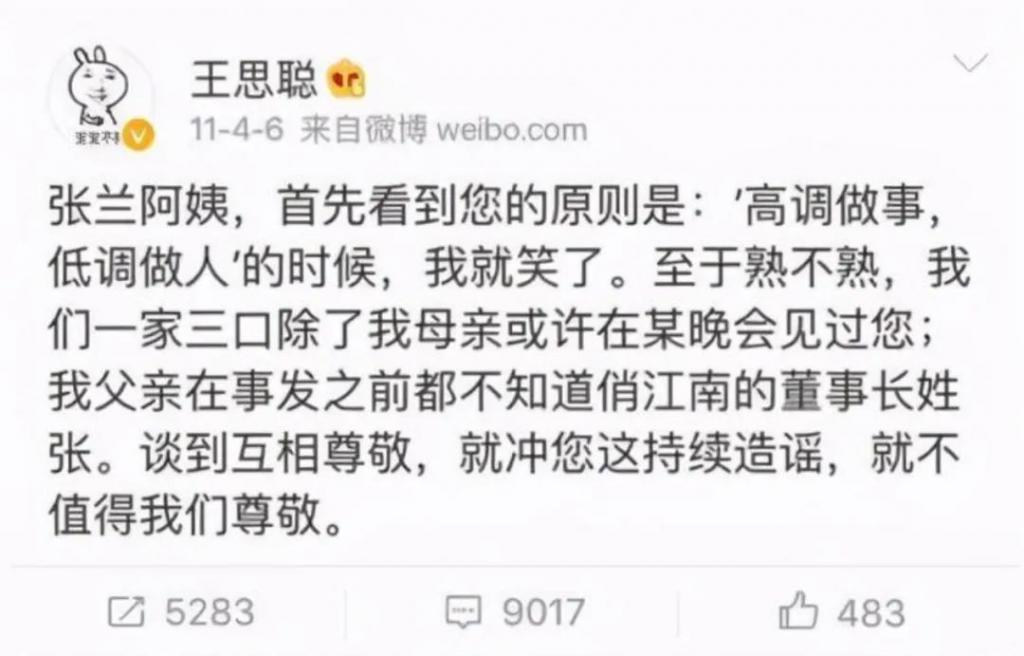皆因张兰一句透露 " 儿子的豪华婚礼由万达集团赞助 ",便点燃了刚回国 2 年的王思聪挑起这场著名骂战的怒火。
