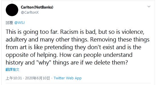 网友Carlton也认为下架的做法很过分,“种族主义是不好的,但暴力等很多其他事也是不好的。从艺术(作品)中去除这些东西就像是假装它们根本不存在,不会有所帮助。如果我们删除它们,人们又该怎样理解历史以及理解很多事物发生的缘由呢。”↓