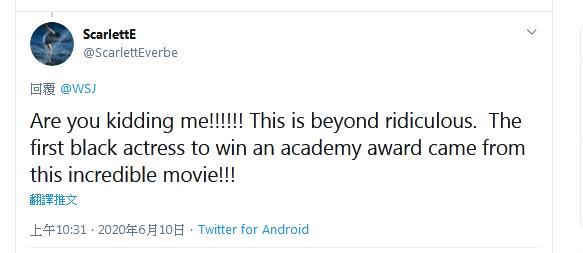 一条来自网友ScarlettE获赞最高的评论写道,“你们这是在开玩笑吧!!!!这太荒唐了。第一位获得奥斯卡的黑人女演员就来自这部不可思议的电影!!!”