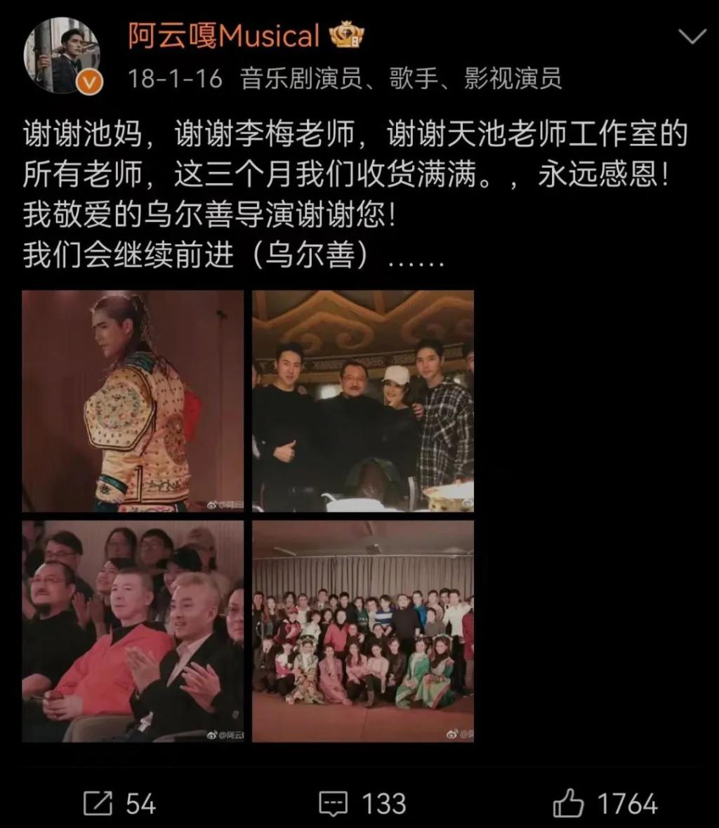 《声入人心》2018 年 11 月开播,阿云嘎 2018 年发的微博里专门感谢了乌尔善导演和刘天池。
