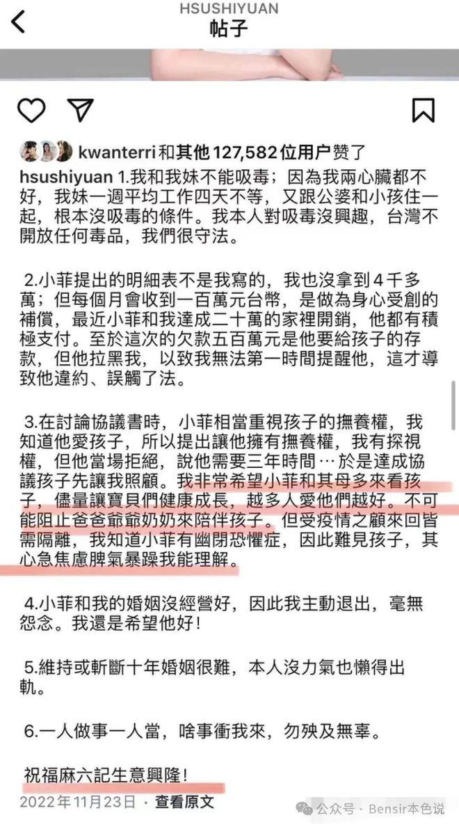 可是她没有,她一边秀恩爱,一边私下让律师找汪小菲上调抚养费,每个月多加 20 万新台币。