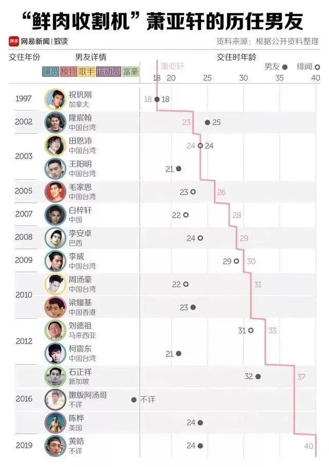 已知目前萧亚轩一共谈过 17 任男友,且没有一任年纪超过她本人,尤其上一任分手的黄皓,更是创了年龄差新高,小了整整 16 岁。