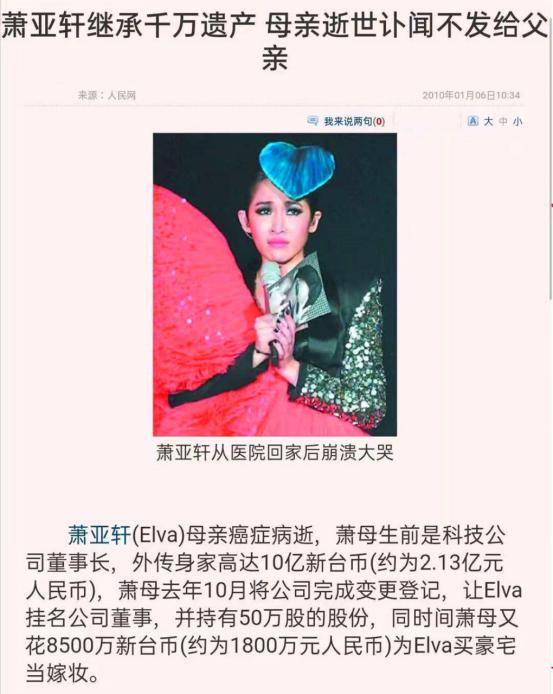 这里就不得不说一下萧亚轩的身家,她的母亲是某半导体公司董事长,2010 年去世时给萧亚轩留下了 2 亿巨额遗产,以及一栋豪宅。