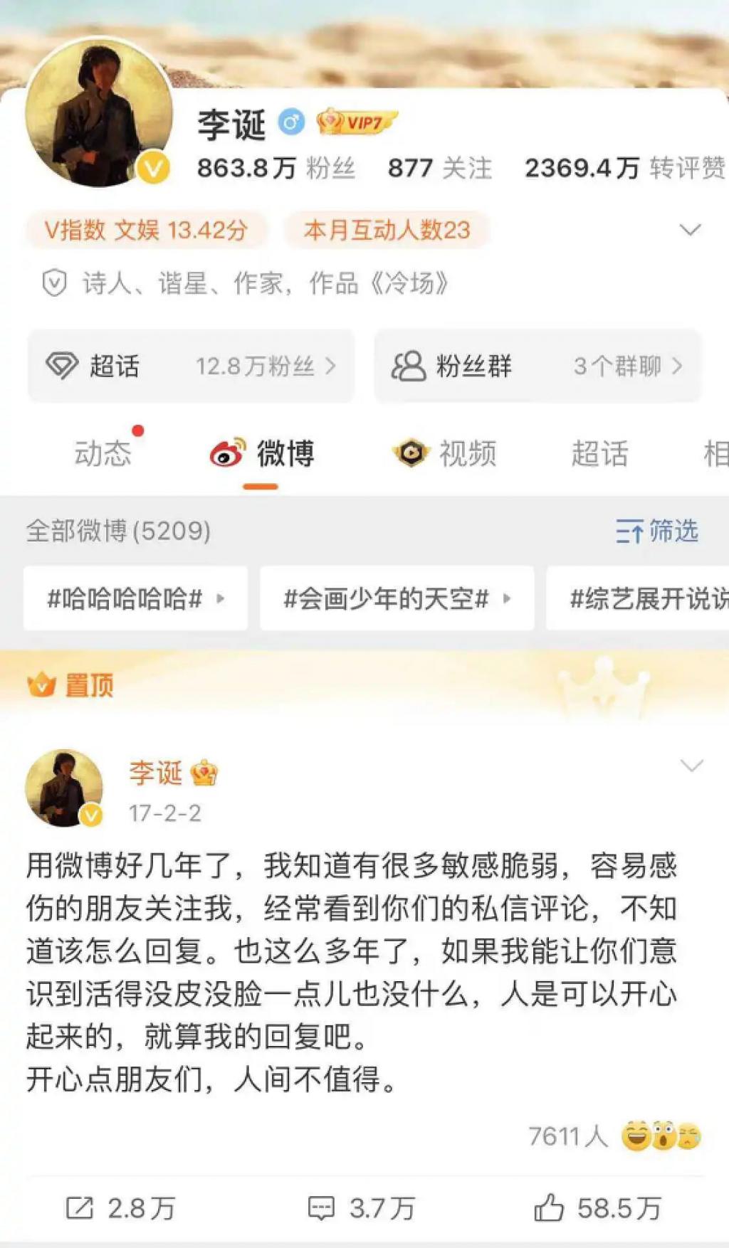 等到苦尽甘来了,他又把微博给锁了,点开就像一个过往李诞的遗址,停留在 17 年的 " 人间不值得 "。
