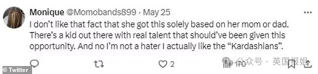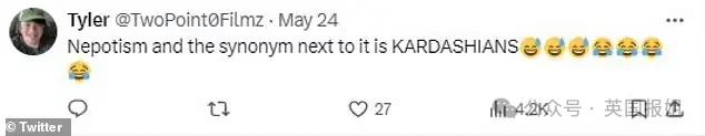 " 我其实是卡戴珊一家的粉丝,但我不喜欢她光靠爸妈就得到了这样的结果。