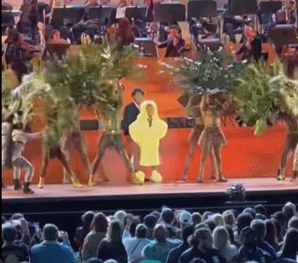 在音乐会真正开始的时候,小西北穿着一套黄色运动套装,戴着一顶毛绒帽子,穿着一双毛茸茸的拖鞋。