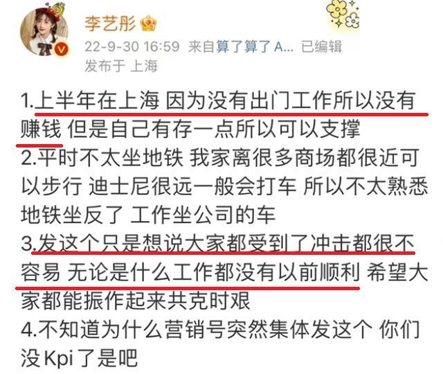 后来李艺彤出面解释,说她只不过想表达当下很多人的事业没有以前顺利,没有要卖惨的意思。