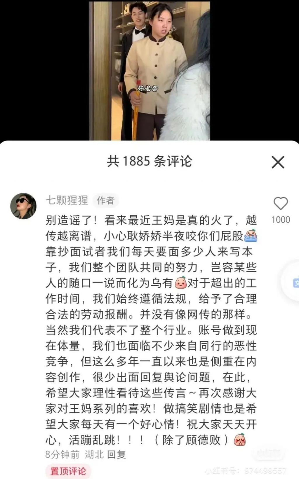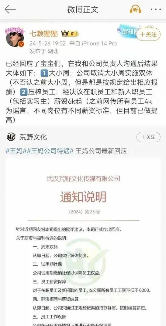 至于其他传闻,王妈公司立正挨打、火速整改:不仅落实了周末双休制度,而且还给试用期的员工也缴纳社保,至于薪资部分无论是在职还是新招聘的员工,保证不低于 6k,群演的薪资按时结算,就连办公电脑也给配上了。