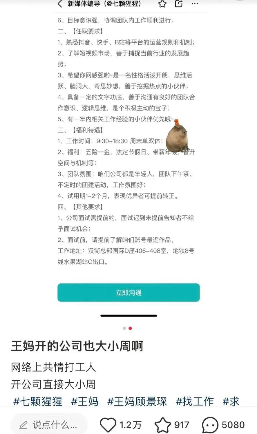 事情的起因是源于一个帖子:有网友吐槽 " 王妈开的公司也大小周啊 ",并截图放上了王妈公司招聘 " 新媒体编导 " 的信息,从这过万的互动数据足以看出,确实是引起了众怒,惹到了不少人。