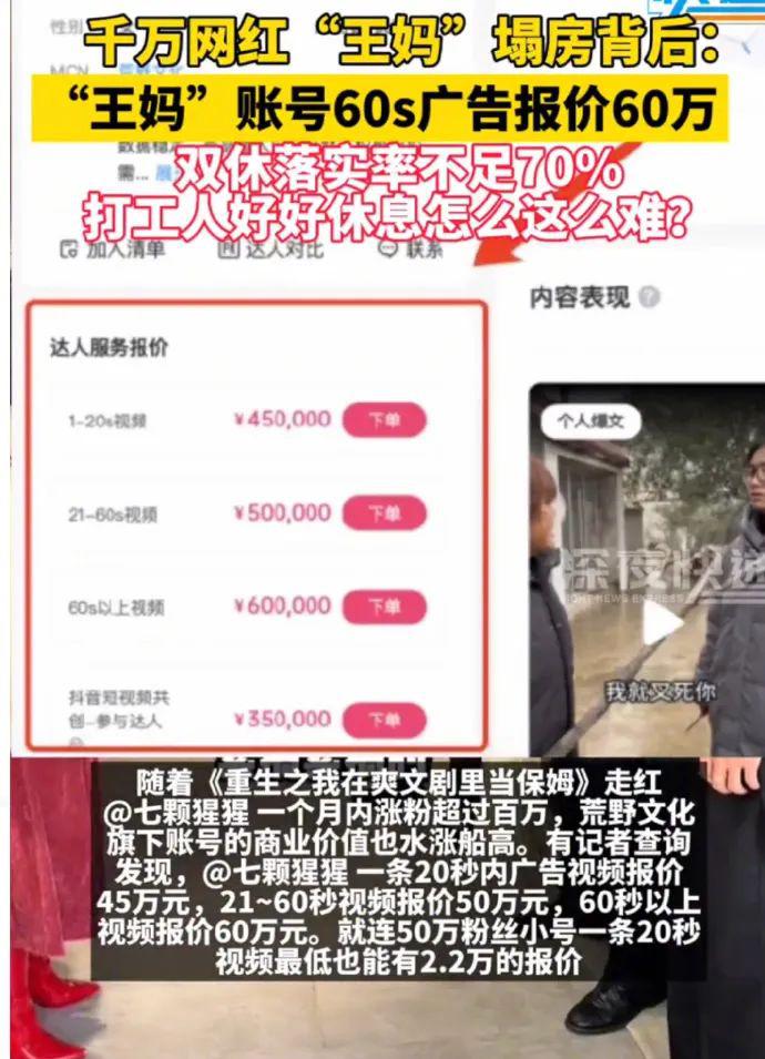 在如今已经趋于饱和的互联网时代,再次勇闯 " 重生 " 短剧赛道,仅仅三月,王妈全网涨粉将近 300 万,一条一分钟的广告报价高达 60 万。