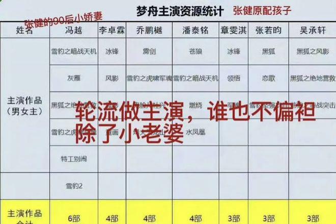 但实际是梦都旗下艺人是轮着做主演的,所有人都主演过至少三部正剧。张健确实有偏心的人,但是是他现任妻子、张若昀后妈冯越,不是他儿子,共主演了六部。