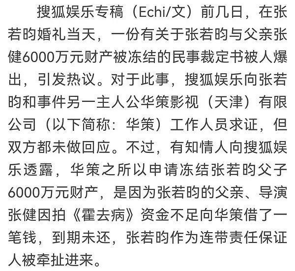 张健曾在张若昀唐艺昕婚礼当天给张若昀送上 " 惊喜大礼 " ——华策一份财产保全裁定书被公布在网上,内容是浙江南北湖梦都影业公司、艺人张若昀、张若昀父亲张健名下共 6000 万元财产被冻结。