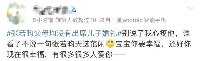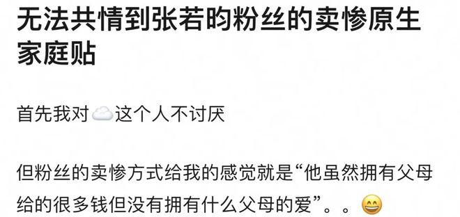 所以不少网友表示无法共情到张若昀粉丝的卖惨,给人一种 " 他虽然拥有父母给的很多钱但没有拥有过什么父母的爱 " 的感觉。甚至有部分网友开始心疼起了张健 ...(?