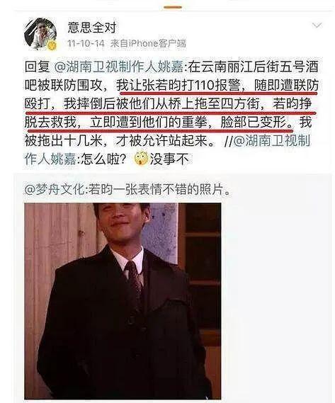张健 2011 年发过的微博,称曾在云南丽江后街五号酒吧被联防围攻,让张若昀打 110 报警,随即遭联防殴打,摔倒后被他们从桥上拖至四方街,张若昀挣脱去救人,立即遭到他们的重拳,脸部已变形。而自己被拖出十几米,才被允许站起来。