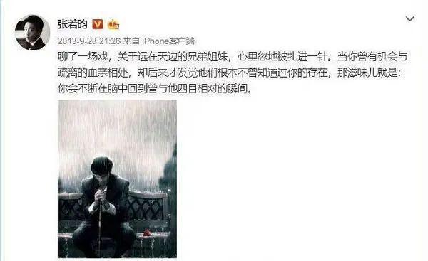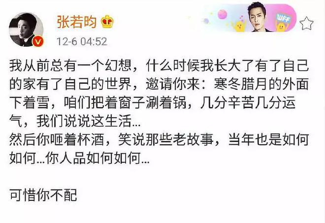 张若昀也曾公开发布过一条意味深长的微博,大概就是说他从前总幻想,什么时候他长大了有了自己的家,想邀请一个人来家里把酒言欢,聊聊过去的故事 ... 最后来了一句 " 可惜你不配 "。