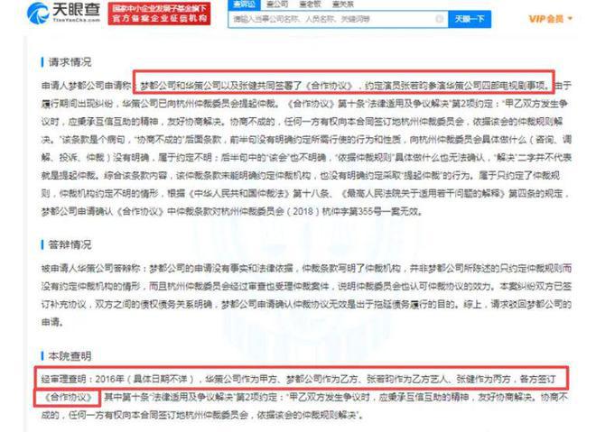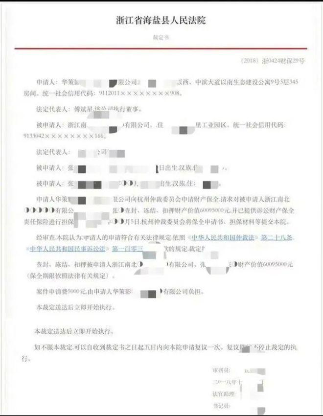 2019 年 6 月,华策向杭州仲裁委员会提出仲裁申请,要求对方返还剩余片酬并支付违约金,相关责任人承担连带责任。同年 9 月,法院出具保全裁定书,裁定冻结梦都和连带责任人 1.5 亿元存款,查封相关责任人(疑似张若昀)名下房产。