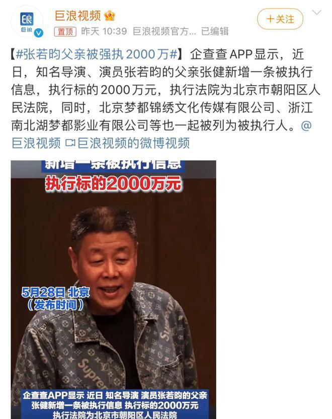 大家这两天有刷到 # 张若昀父亲被强执 2000 万 # 的热搜吗?点进去第一条就是:据企查查 APP 显示,近日,知名导演张健新增一条被执行信息,执行标的 2000 万元,执行法院为北京市朝阳区人民法院。
