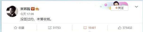 该纠纷在网上曝光后,张若昀第一时间就发文表示 " 没签过约,未曾收钱 "。随后还提供了司法鉴定书,证明了《合作协议》上自己的签名是他人伪造的。