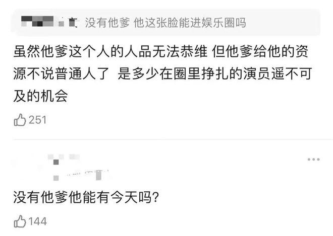 但俗话说,祸不及子女的前提是惠不及子女。有的网友看来,粉丝口中张健对张若昀再不好,早几年前他给张若昀砸的资源也不是假的,纷纷 " 没有他爹他能有今天吗、没有他爹他这张脸能进娱乐圈吗、他爹给他的资源是多少在圈里挣扎的演员遥不可及的机会 ..."。