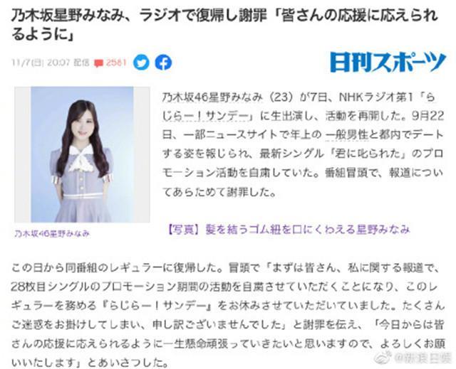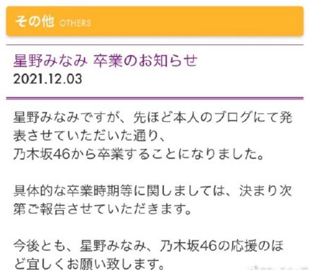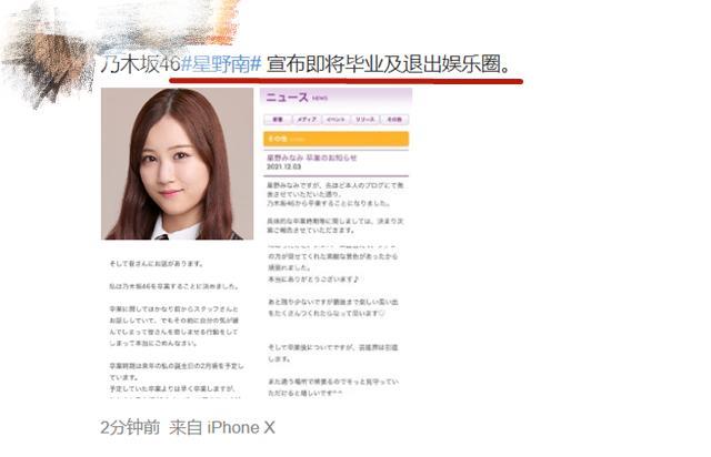 12月3日,日本女团乃木坂46的成员星野南宣布即将毕业退出娱乐圈。毕业的时间定在了明年的2月份,自此,星野南即将结束自己长达10年的偶像生活,而选择退出娱乐圈的导火索则是两个月前的一则负面新闻,星野南被拍到与富二代过夜。