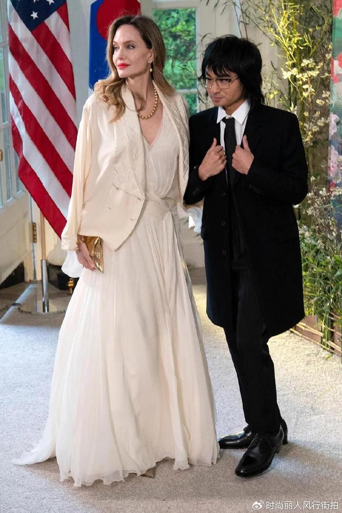 朱莉前段时间受邀去白宫出席晚宴,也是这件香奈儿的开衫,果然是很节约,单品重复利用。当时带着养子一起去的。拜登夫妇当时是招待韩国总统夫妇,而朱莉的到来,让人见识到了科技脸和自然脸的差别。