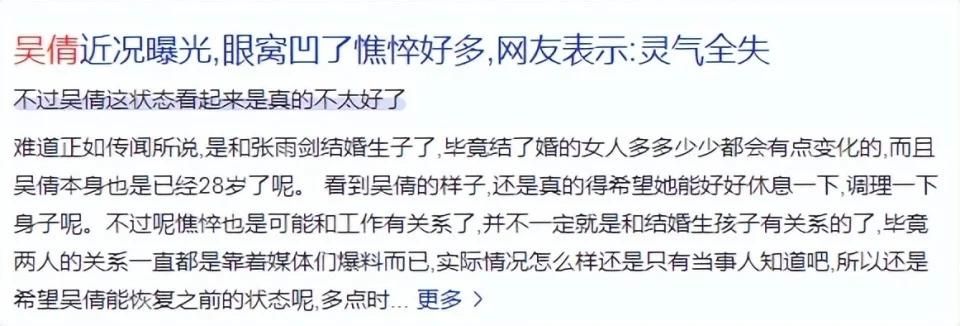 但是过早生子仿佛断送了吴倩的灵气,她一度变得苍老、两眼无光,官宣离婚后和罗云熙再度搭档出演了《追光者》,状态也不及从前。