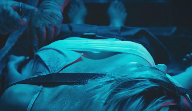 开篇,就是女性被做实验,而拍摄角度正正好好把胸口的位置摆到了画面中间。