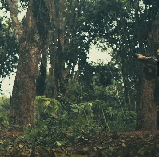 这两步道走得实在是太搞笑了,感觉下一秒这姐就能被树杈子绊倒,枪都拿不稳还威胁别人呢。