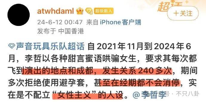 女生称,李哲在已婚状态下,从 2021 年 11 月至今近 3 年的时间里持续出轨,经常将女生骗到成都或者演出地点上床,两人发生关系 240 多次,拒绝使用避孕套,连女生在姨妈期都不放过。