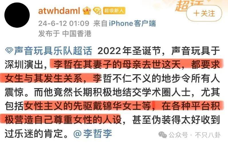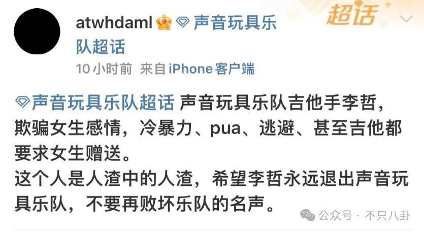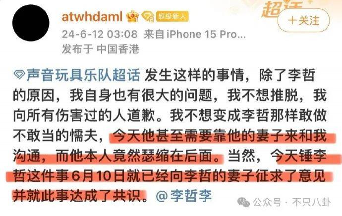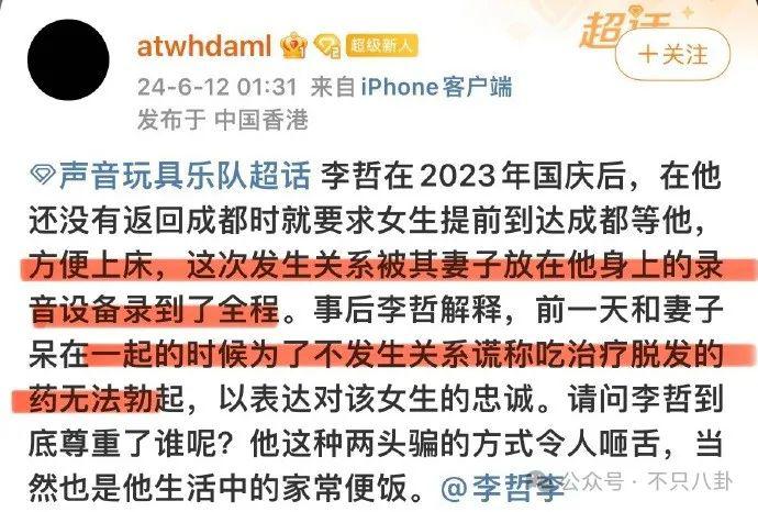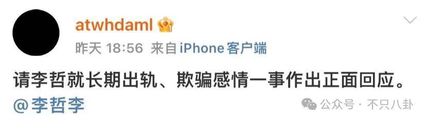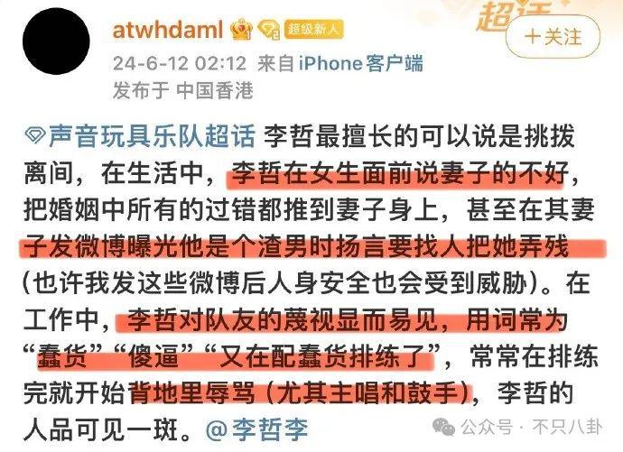 昨晚 6 点多,一位网友发文直指李哲长期出轨,欺骗感情,怒斥他是人渣中的人渣。