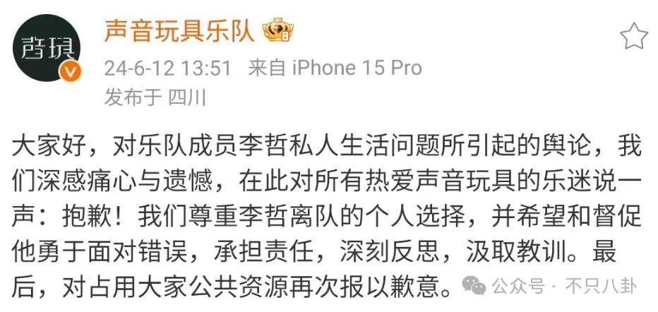 声音玩具乐队今天下午也发了声明,向乐迷道歉,重申李哲会离开乐队。