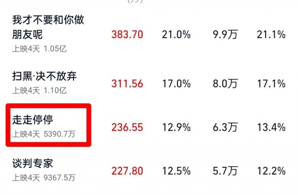 同样的票房遇冷——《不虚此行》仅不到三千万,《走走停停》相比其它几部破亿影片,成绩算不上漂亮。