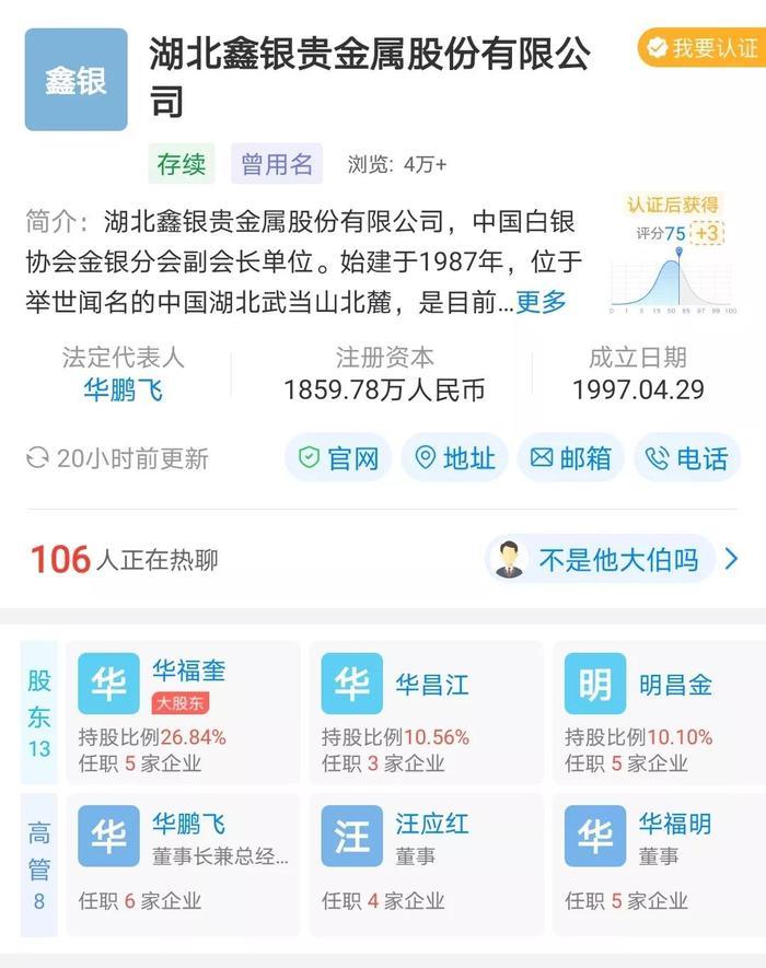 华福奎是湖北鑫银贵金属股份有限公司大股东,持股26.84%,公司注册资本1859.78万元。官网介绍,公司始建于1987年,位于举世闻名的中国湖北武当山北麓。湖北银矿是国内首家采选冶一体化白银矿山和最早进行白银深加工的独立银矿山。
