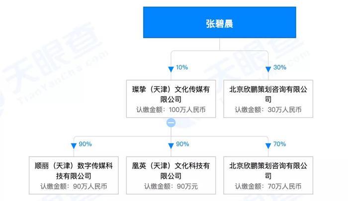 天眼查显示,张碧晨参股两家公司,分别是北京欣鹏策划咨询有限公司和璨挚(天津)文化传媒有限公司,不过均不是最终受益人。与华晨宇的商业版图也没有交集。