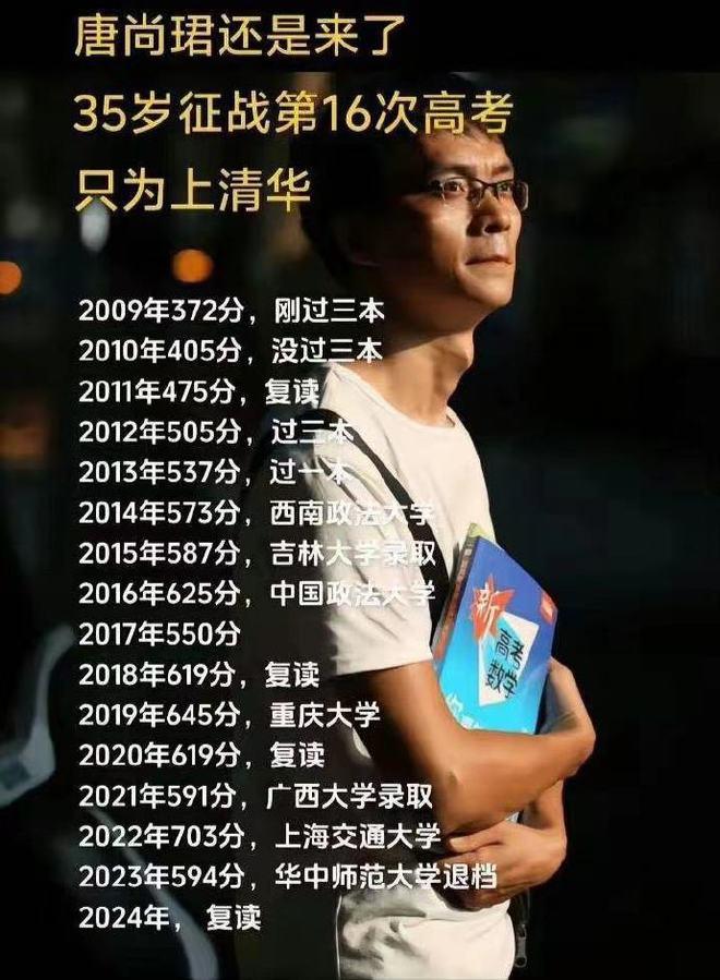 6 月 17 日传来唐尚珺的最新动态,他的第 16 次高考可能和往年一样,将有可能无缘清华北大这样子的名校。