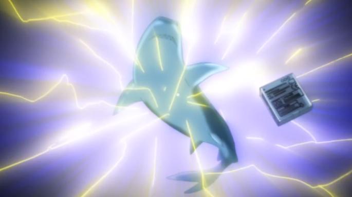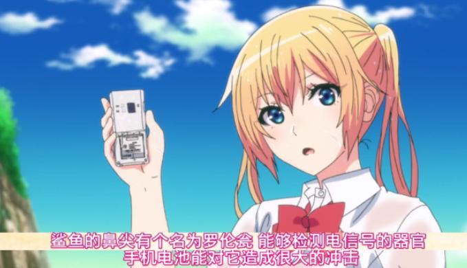 之后,她们发现了不远处的岛屿,也就是动画刚开始的那座岛。她们打算游过去,但是一只鲨鱼出现并尾随她们。这一次又是鬼岛化解了危机,她用手机电池驱赶走了鲨鱼,因为鲨鱼的鼻尖处有罗伦瓮这个器官,是用来检测电信号的,手机电池能对它造成很大的冲击,所以驱赶掉了鲨鱼。