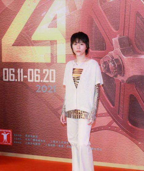 窦靖童本次红毯造型,以叠穿风格展现摩登嬉皮风;白色优雅清新,选用V领短袖上衣叠穿不规则条纹打底衫,融入亮面金色元素,更是显得时髦复古;