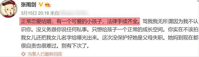 只见张雨剑坦白发文自己和孩子他妈是按照正规程序,恋爱结婚生孩子,不存在什么非法途径,他个人认为自己没必要跟网友解释什么,这是自己的私事,大方表示网友可以来攻击自己,因为张雨剑并不认识你,不怕那些有心人来骂他。
