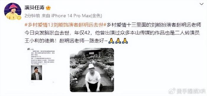 演员任涛发文悼念赵明远,希望他一路走好。