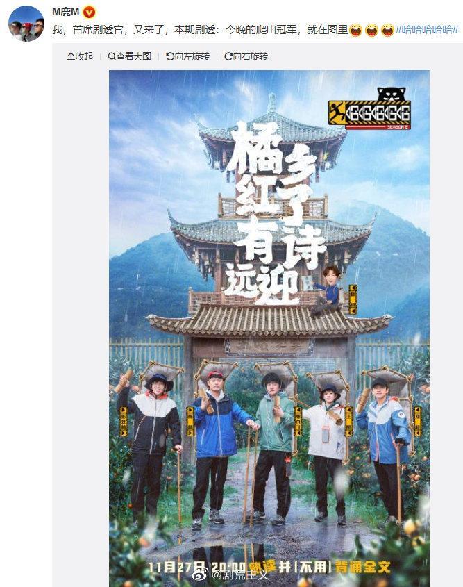 #鹿晗无效剧透# 他来了,他来了,剧透大王向我们走来啦。鹿晗发博:“我,首席剧透官,又来了,本期剧透:今晚的爬山冠军,就在图里