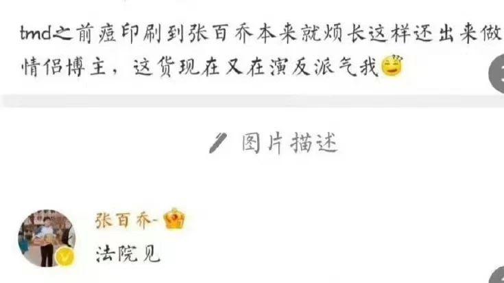 张百乔于是坚持不懈地在他的广场上巡逻,发现有人在骂他,就马上回复一句 " 法院见 "。