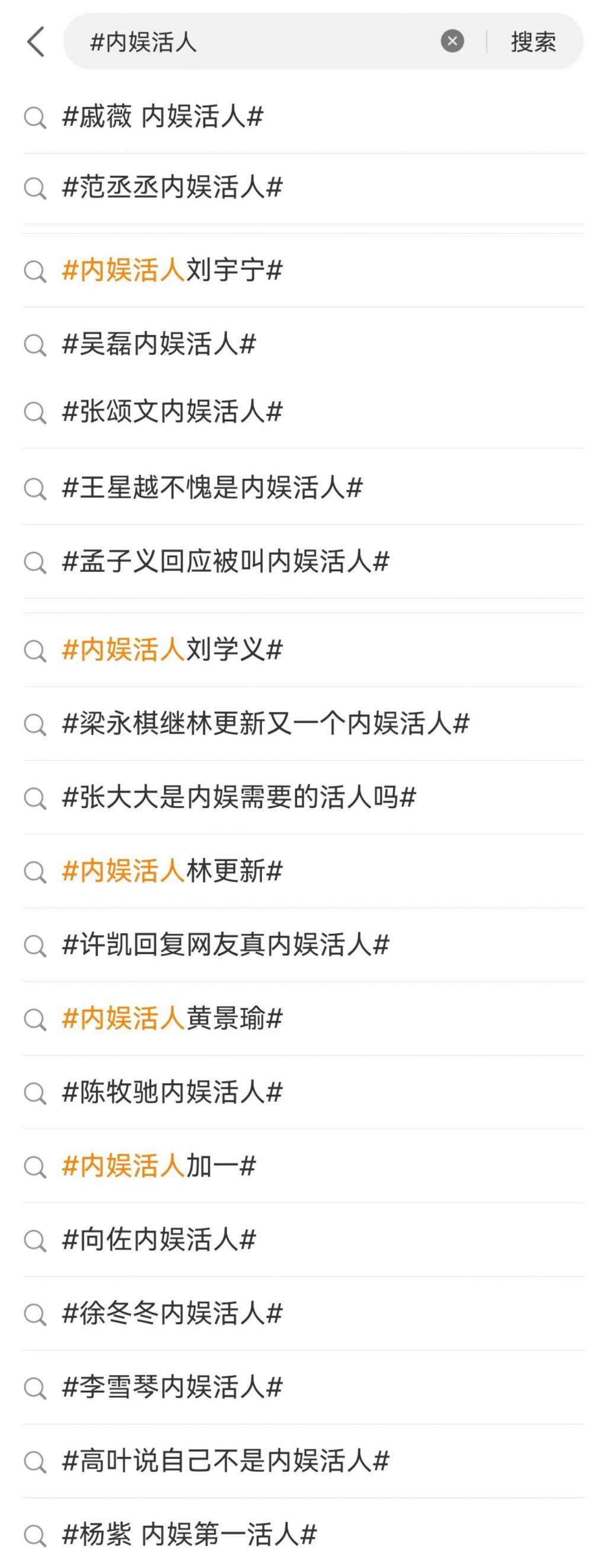 在搜索框输入 " 内娱活人 " 四个字,后面能跟着一大串各种艺人的大名。