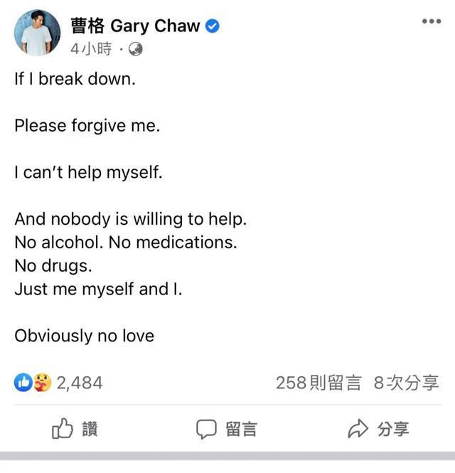 先是向老婆表白,然后又隔空喊话,对峙媒体,这一连串的迷惑行为不禁让人怀疑曹格是不是又喝多了胡言乱语。正当网友疑惑之时,曹格用英文阐述了目前的状态,他表示:如果我崩溃了,那么请原谅我。我控制不住自己,而且没人愿意伸出援助之手。同时他也强调没嗑药,更没有喝酒,只有自己,没有爱。