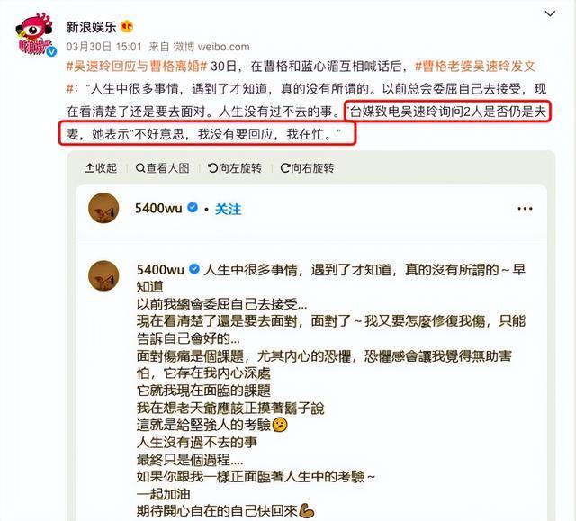 而当事人吴速玲看到曹格这波操作也说了一段意味深长的话,字里行间都在吐露目前的状况很糟。随后有台媒致电吴速玲和曹格还是不是夫妻关系,对方并没有给出答案,而是以不回应在忙为借口搪塞了过去。