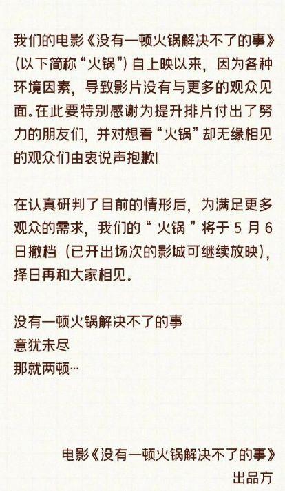 今年五一档还有一部影片的撤档引起观众热议,那就是杨幂的新作《没有一顿火锅解决不了的事情》。