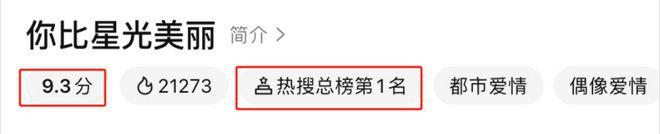 根据数据显示,电视剧《你比星光美丽》上线首日就拿下了卫视黄金档收视第一的成绩,网播平台方面,甚至直接拿下了 9.3 的高分,成为热搜总榜第一的爆款。